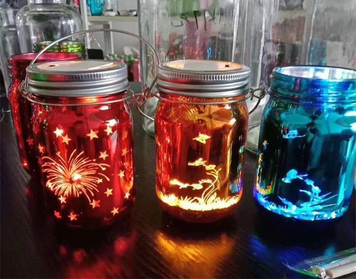 蒙砂酒瓶是在制品玻璃上,粘附一定大小面積的玻璃色釉粉,玻璃瓶廠經(jīng)過580~600℃的高溫烘烤,使玻璃色釉涂層凝結(jié)在玻璃外表,并顯現(xiàn)出具有與玻璃主體不同顏色的一種裝飾辦法。粘附玻璃色釉粉,可用排筆涂刷,亦可用膠輥滾涂。經(jīng)過絲印加工,能夠得到蒙砂面的樓空?qǐng)D案。 其辦法是:在玻璃制品外表上,絲印一層由阻熔劑構(gòu)成的圖案紋樣。